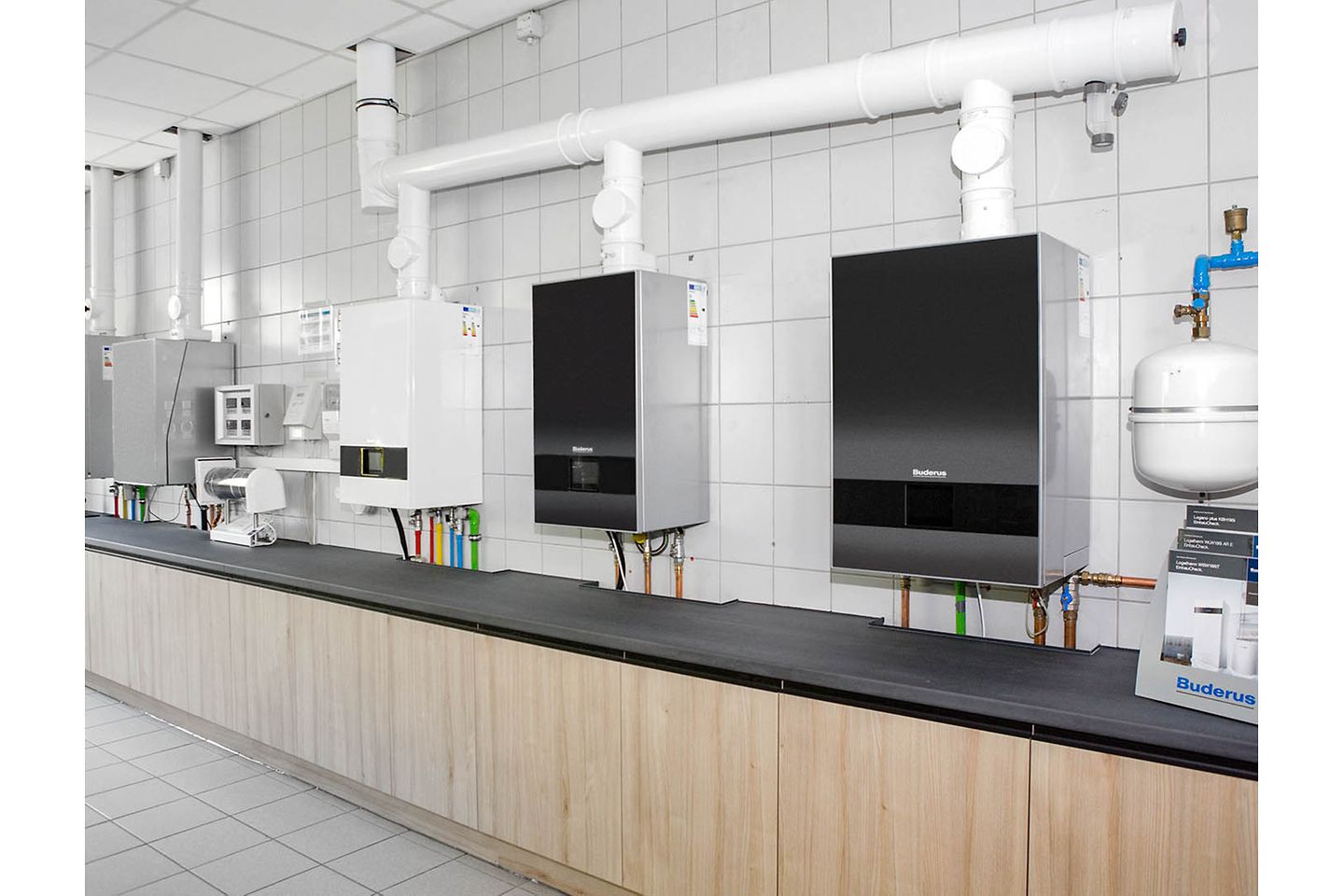 In einer Ausstellung zeigt Buderus am modernisierten Standort Mainz die aktuellen Wärmeerzeuger. Auch Anlagenbetreiber können sich hier informieren