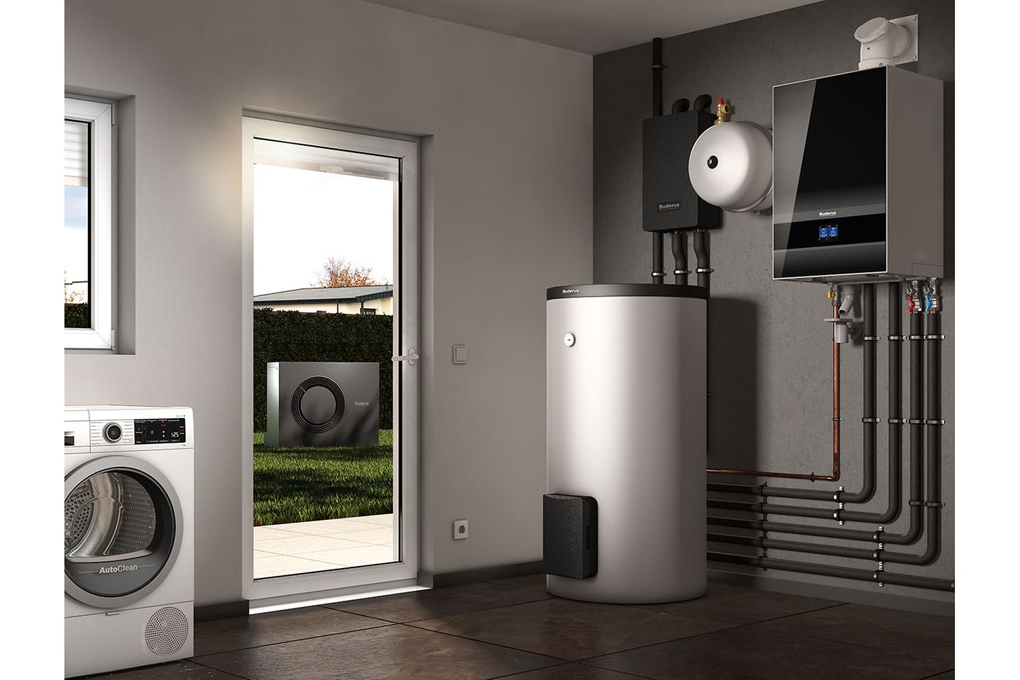 Nachrüstung bestehender Brennwert-Wärmeerzeuger: Mit den Ergänzungspaketen von Buderus den vorhandenen Wärmeerzeuger mit einer Wärmepumpen-Außeneinheit ergänzen und so schrittweise klimaneutraler heizen